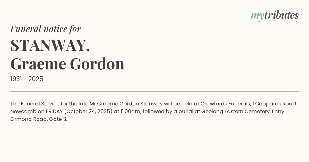 15°CThe Funeral Service for the late Mr Graeme Gordon Stanway will be held at Crawfords Funerals, 1 Coppards Road Newcomb on FRIDAY (October 24, 2025) at 11.00am, followed by a burial at Geelong Eastern Cemetery, Entry Ormond Road, Gate 3.