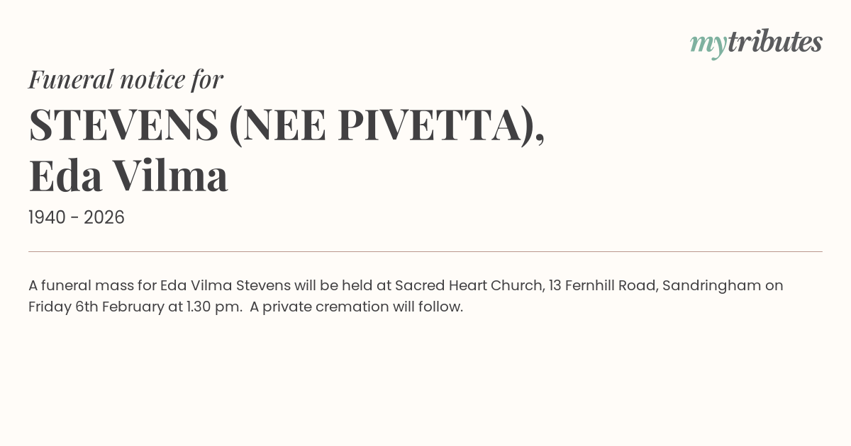 15°CA funeral mass for Eda Vilma Stevens will be held at Sacred Heart Church, 13 Fernhill Road, Sandringham on Friday 6th February at 1.30 pm. A private cremation will follow.