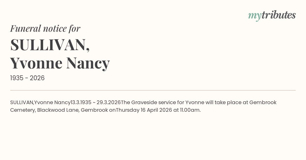 The Graveside service for Yvonne will take place at Gembrook Cemetery, Blackwood Lane, Gembrook on