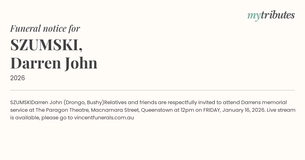 Relatives and friends are respectfully invited to attend Darren’s memorial service at The Paragon Theatre, Macnamara Street, Queenstown at 12pm on FRIDAY, January 16, 2026. Live stream is available, please go to vincentfunerals.com.au