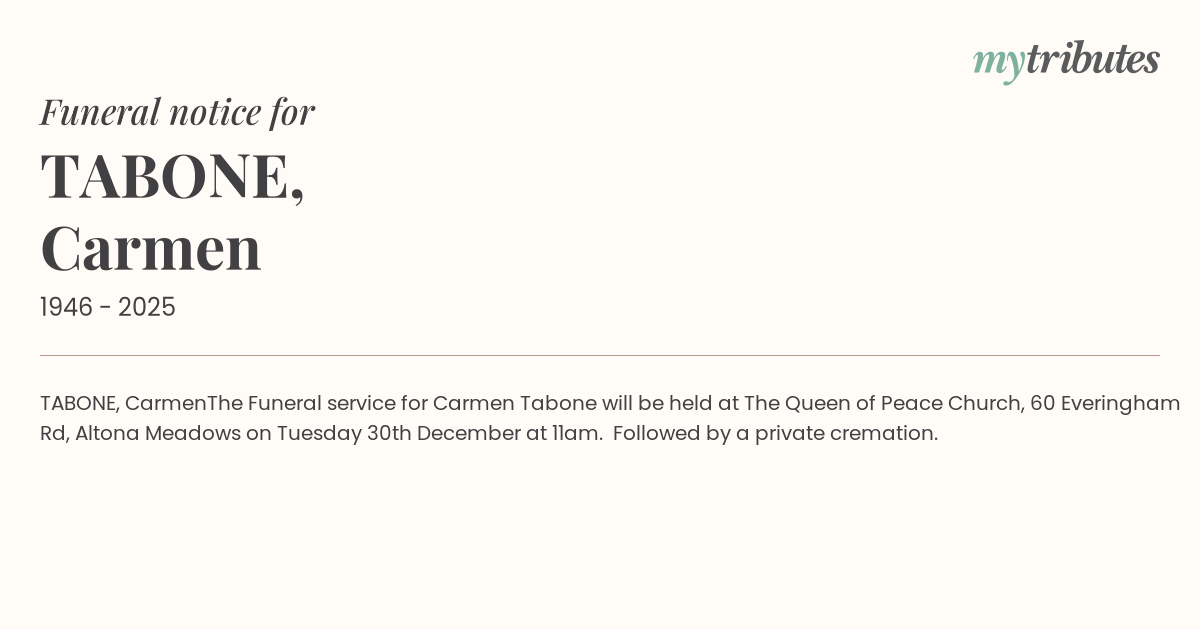 The Funeral service for Carmen Tabone will be held at The Queen of Peace Church, 60 Everingham Rd, Altona Meadows on Tuesday 30th December at 11am. Followed by a private cremation.