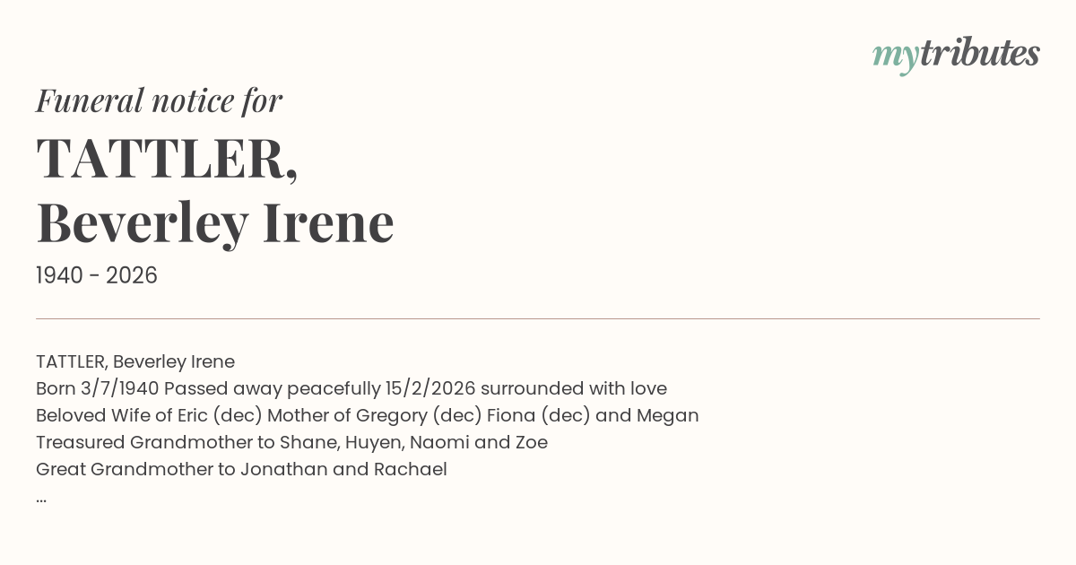 Born 3/7/1940 Passed away peacefully 15/2/2026 surrounded with love
