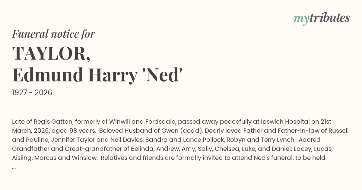 15°CLate of Regis Gatton, formerly of Winwill and Fordsdale, passed away peacefully at Ipswich Hospital on 21st March, 2026, aged 98 years.