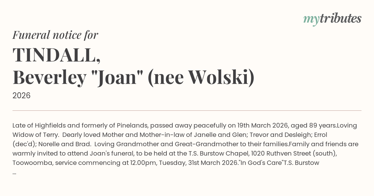 Family and friends are warmly invited to attend Joan's funeral, to be held at the T.S. Burstow Chapel, 1020 Ruthven Street (south), Toowoomba, service commencing at 12.00pm, Tuesday, 31st March 2026.