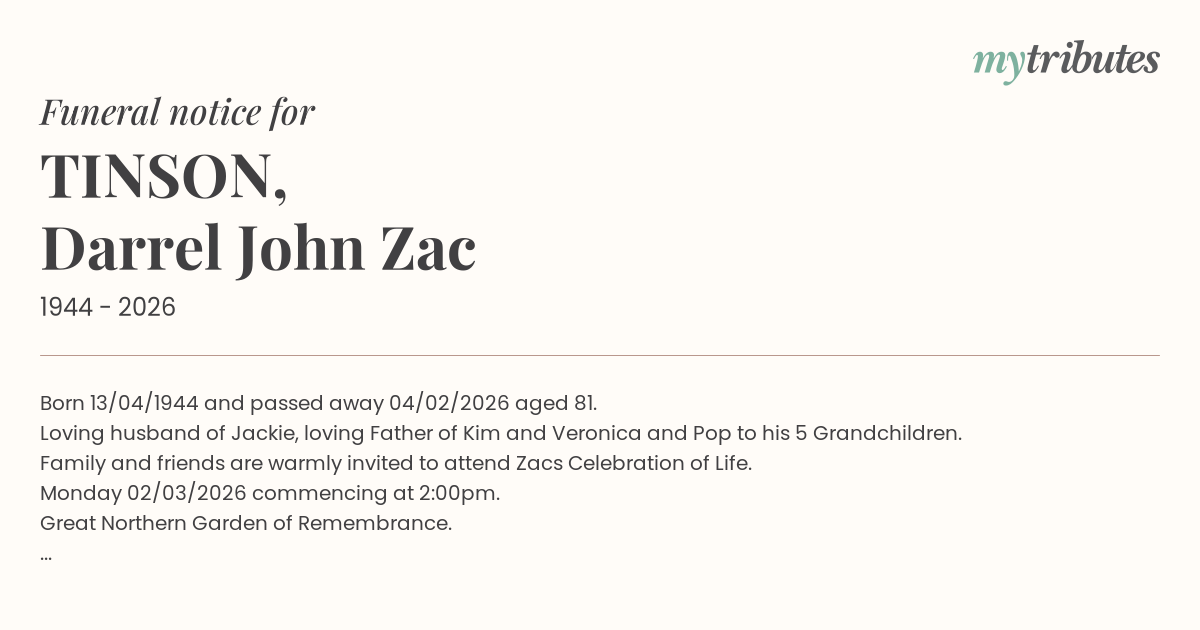 15°CBorn 13/04/1944 and passed away 04/02/2026 aged 81.