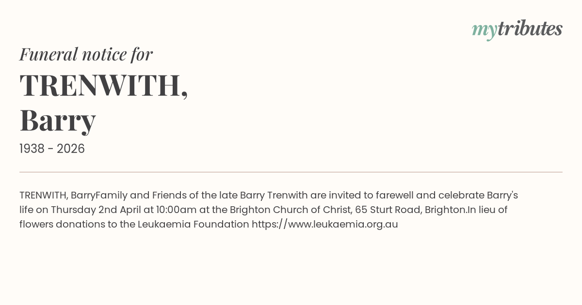 Family and Friends of the late Barry Trenwith are invited to farewell and celebrate Barry's life on Thursday 2nd April at 10:00am at the Brighton Church of Christ,