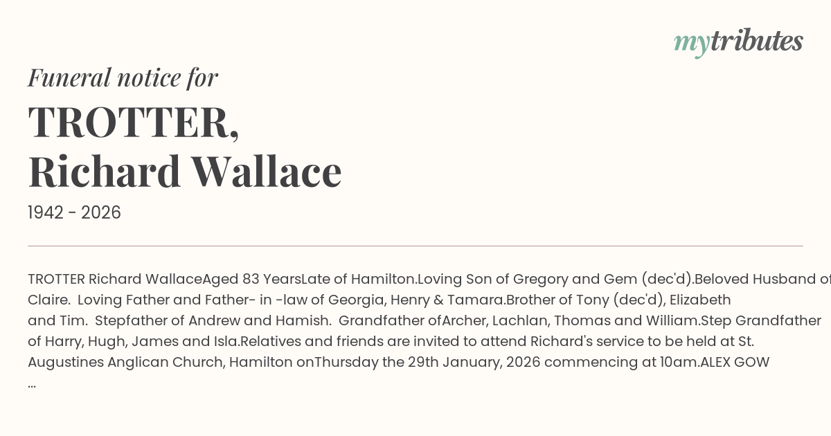 Relatives and friends are invited to attend Richard's service to be held at St. Augustines Anglican Church, Hamilton on