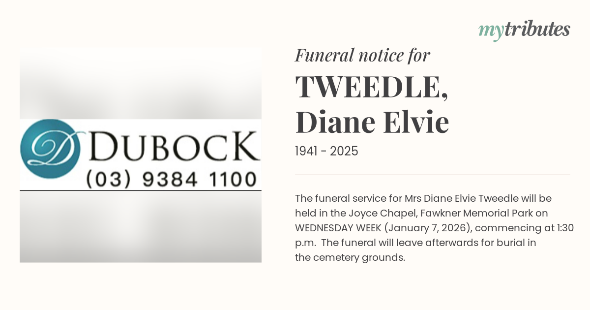 15°CThe funeral service for Mrs Diane Elvie Tweedle will be held in the Joyce Chapel, Fawkner Memorial Park on WEDNESDAY WEEK (January 7, 2026), commencing at 1:30 p.m. The funeral will leave afterwards for burial in the cemetery grounds.