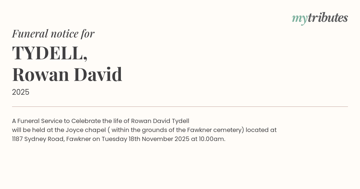 15°CA Funeral Service to Celebrate the life of Rowan David Tydell