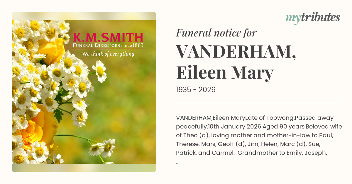 Beloved wife of Theo (d), loving mother and mother-in-law to Paul, Therese, Mars, Geoff (d), Jim, Helen, Marc (d), Sue, Patrick, and Carmel. Grandmother to Emily, Joseph, Anthony, Greta, Michael, Catherine, Nicole, Joel, Erica, Monique, James, John, Mitchell, Gabrielle, and Brigitte. Great- grandmother to Fallon, Trudie, Alex, Matt, Kyra, Lucy, Josie, Ellie, Matthew, Raf, Bella, Dom, Maddie, Lucy, Winnie, Henry, Emmy, Lewis, and Lachlan.