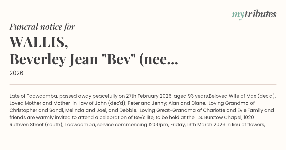 Family and friends are warmly invited to attend a celebration of Bev's life, to be held at the T.S. Burstow Chapel, 1020 Ruthven Street (south), Toowoomba, service commencing 12:00pm, Friday, 13th March 2026.