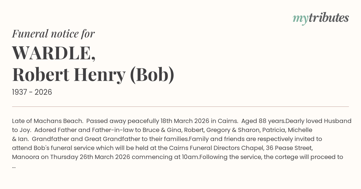 Family and friends are respectively invited to attend Bob's funeral service which will be held at the Cairns Funeral Directors Chapel, 36 Pease Street, Manoora on Thursday 26th March 2026 commencing at 10am.
