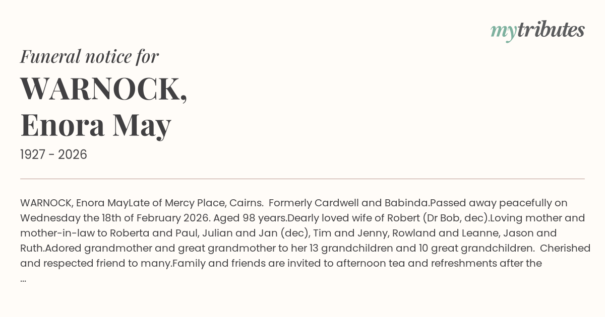 Family and friends are respectfully invited to attend Enora’s funeral service which will be held at Black’s Funerals Chapel, 18 Scullen Avenue, Innisfail, on Monday the 16th of March 2026 commencing at 10:30am