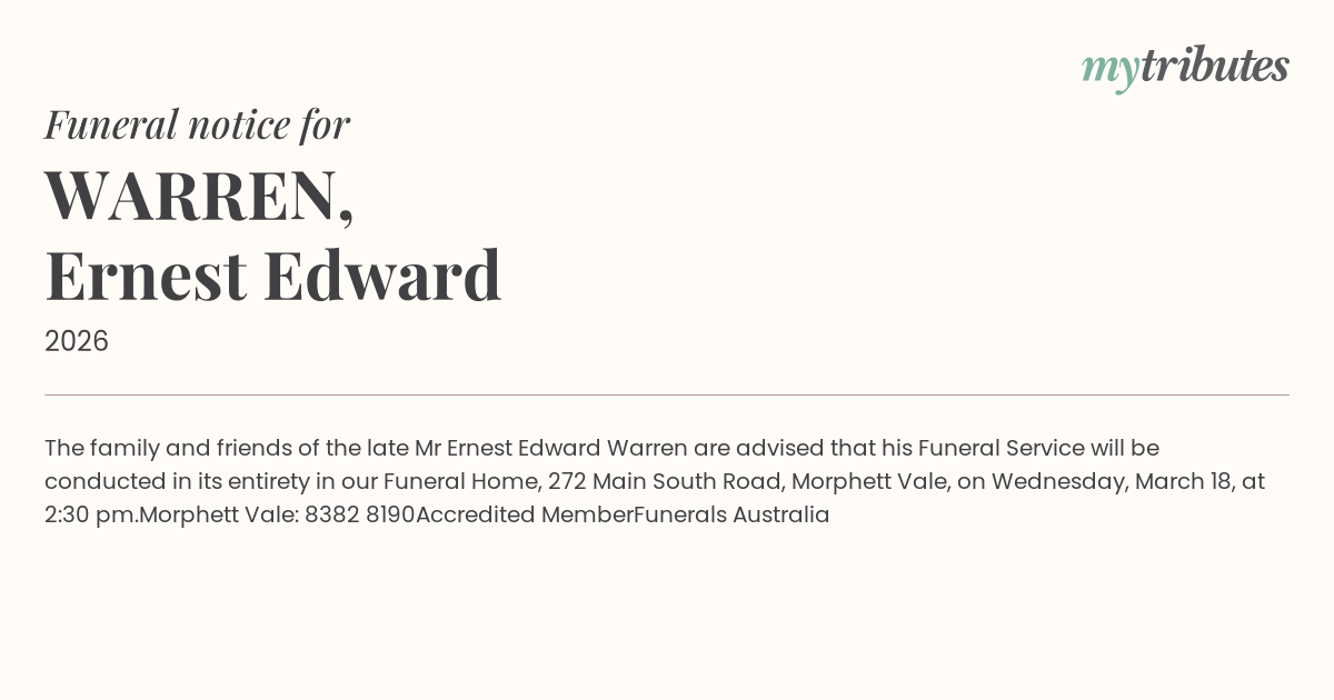 15°CThe family and friends of the late Mr Ernest Edward Warren are advised that his Funeral Service will be conducted in its entirety in our Funeral Home, 272 Main South Road, Morphett Vale, on Wednesday, March 18, at 2:30 pm.