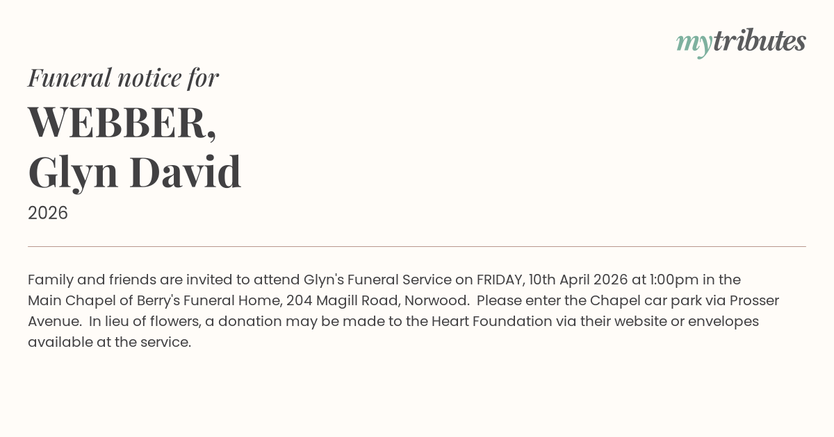 15°CFamily and friends are invited to attend Glyn's Funeral Service on FRIDAY, 10th April 2026 at 1:00pm in the Main Chapel of Berry's Funeral Home, 204 Magill Road, Norwood.