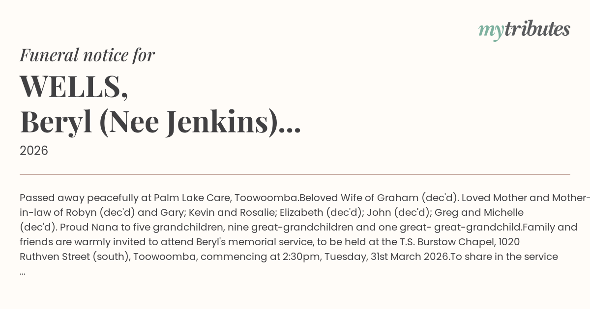 Family and friends are warmly invited to attend Beryl's memorial service, to be held at the T.S. Burstow Chapel, 1020 Ruthven Street (south), Toowoomba, commencing at 2:30pm, Tuesday, 31st March 2026.