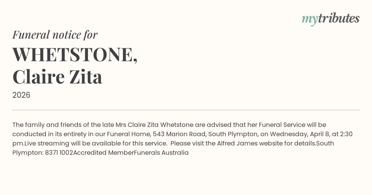 15°CThe family and friends of the late Mrs Claire Zita Whetstone are advised that her Funeral Service will be conducted in its entirety in our Funeral Home, 543 Marion Road, South Plympton, on Wednesday, April 8, at 2:30 pm.
