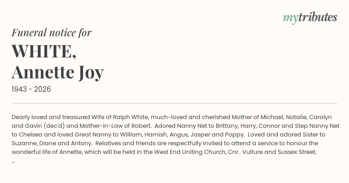 15°CDearly loved and treasured Wife of Ralph White, much-loved and cherished Mother of Michael, Natalie, Carolyn and Gavin (dec'd) and Mother-in-Law of Robert. Adored Nanny Net to Brittany, Harry, Connor and Step Nanny Net to Chelsea and loved Great Nanny to William, Hamish, Angus, Jasper and Poppy. Loved and adored Sister to Suzanne, Diane and Antony. Relatives and friends are respectfully invited to attend a service to honour the wonderful life of Annette, which will be held in the West End Uniting Church, Cnr. Vulture and Sussex Street, West End at on Friday, March 13, 2026 commencing at 11:00 a.m. Annette loved the colour blue. Please feel free to wear a little blue to celebrate her life.