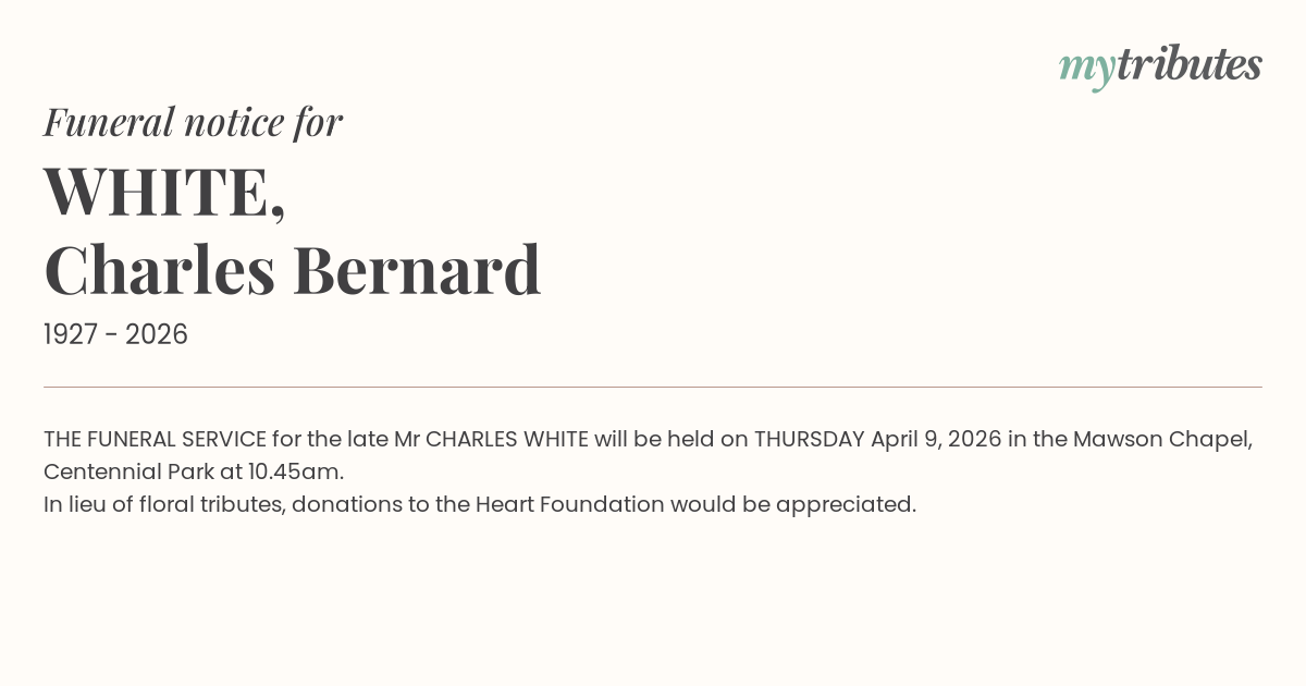 15°CTHE FUNERAL SERVICE for the late Mr CHARLES WHITE will be held on THURSDAY April 9, 2026 in the Mawson Chapel, Centennial Park at 10.45am.