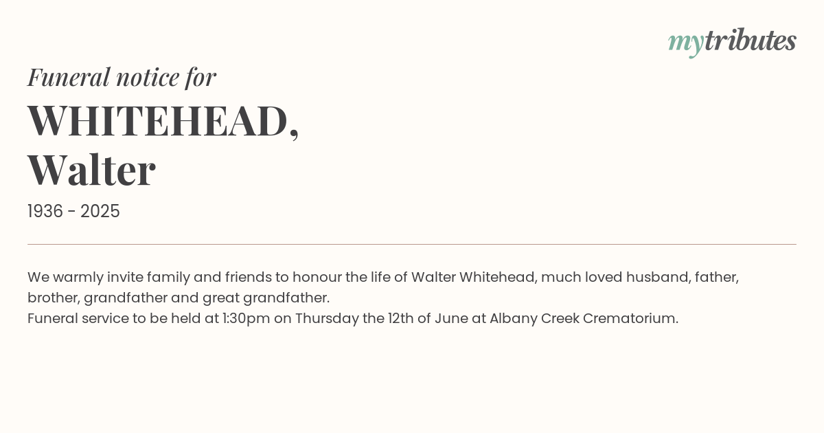 15°CWe warmly invite family and friends to honour the life of Walter Whitehead, much loved husband, father, brother, grandfather and great grandfather.