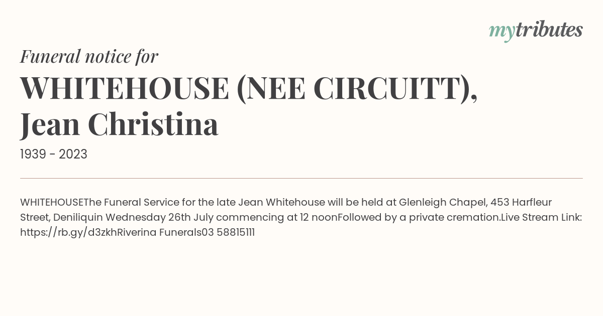 The Funeral Service for the late Jean Whitehouse will be held at Glenleigh Chapel, 453 Harfleur Street, Deniliquin Wednesday 26th July commencing at 12 noon