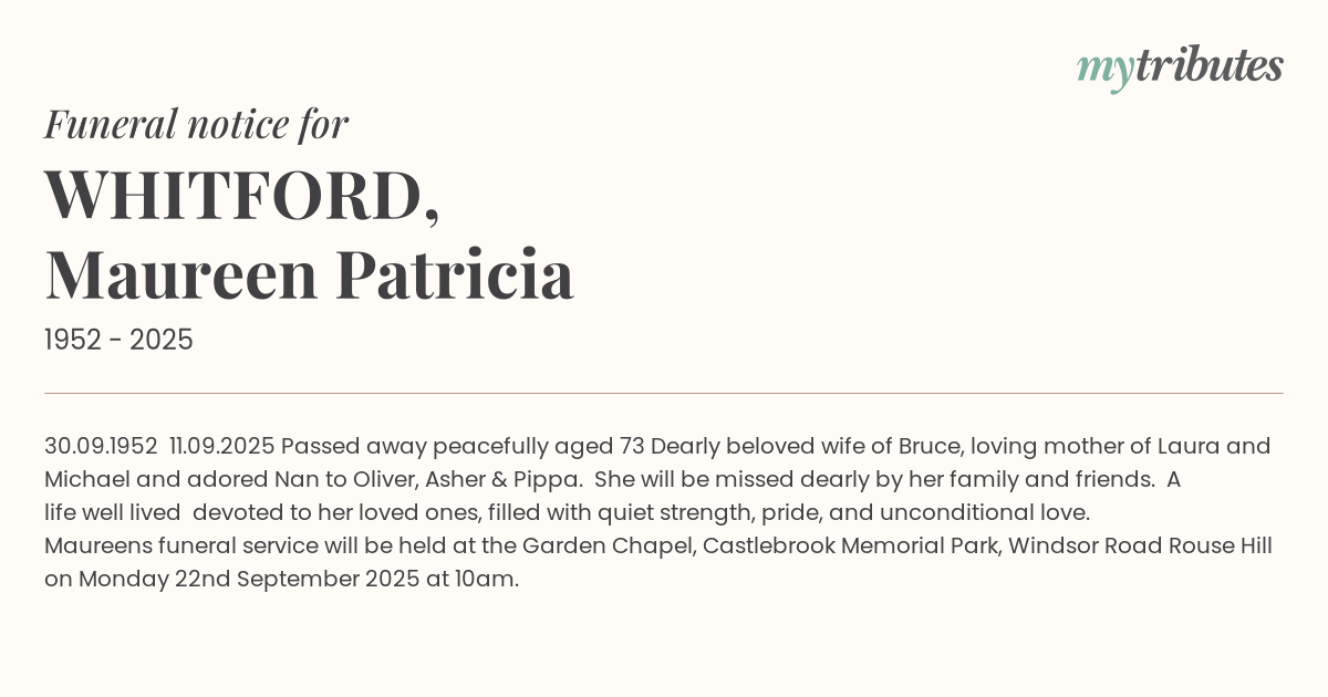 15°C30.09.1952 – 11.09.2025 Passed away peacefully aged 73 Dearly beloved wife of Bruce, loving mother of Laura and Michael and adored Nan to Oliver, Asher & Pippa. She will be missed dearly by her family and friends. A life well lived — devoted to her loved ones, filled with quiet strength, pride, and unconditional love. Maureen’s funeral service will be held at the Garden Chapel, Castlebrook Memorial Park, Windsor Road Rouse Hill on Monday 22nd September 2025 at 10am.