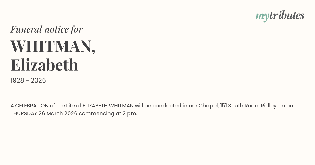15°CA CELEBRATION of the Life of ELIZABETH WHITMAN will be conducted in our Chapel, 151 South Road, Ridleyton on THURSDAY 26 March 2026 commencing at 2 pm.