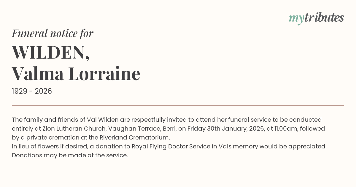 15°CThe family and friends of Val Wilden are respectfully invited to attend her funeral service to be conducted entirely at Zion Lutheran Church, Vaughan Terrace, Berri, on Friday 30th January, 2026, at 11.00am, followed by a private cremation at the Riverland Crematorium.
