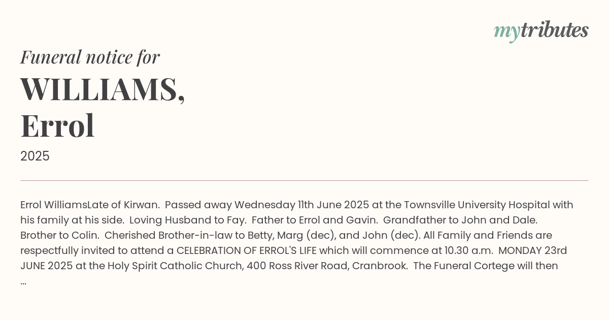 All Family and Friends are respectfully invited to attend a CELEBRATION OF ERROL'S LIFE which will commence at 10.30 a.m. MONDAY 23rd JUNE 2025 at the Holy Spirit Catholic Church, 400 Ross River Road, Cranbrook. The Funeral Cortege will then proceed to the Belgian Gardens Cemetery for Committal and Interment.