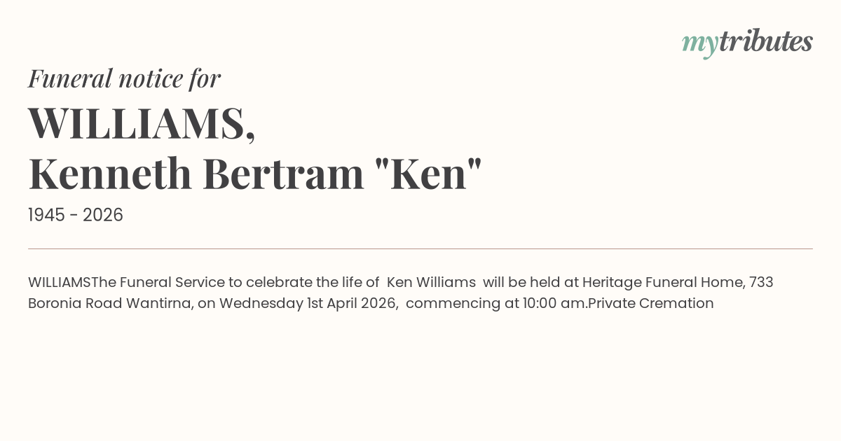 Heritage Funeral Home, 733 Boronia Road Wantirna, on Wednesday 1st April 2026, commencing at 10:00 am.