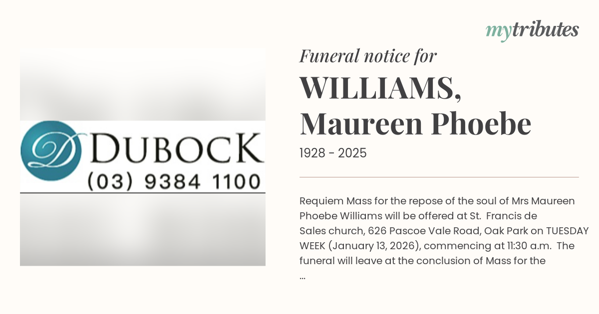 15°CRequiem Mass for the repose of the soul of Mrs Maureen Phoebe Williams will be offered at St. Francis de Sales church, 626 Pascoe Vale Road, Oak Park on TUESDAY WEEK (January 13, 2026), commencing at 11:30 a.m. The funeral will leave at the conclusion of Mass for the Northern Memorial Park.