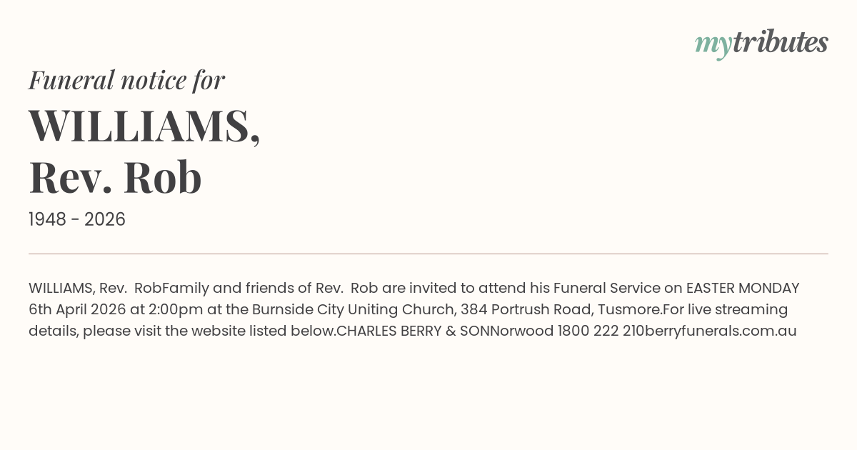 Family and friends of Rev. Rob are invited to attend his Funeral Service on EASTER MONDAY 6th April 2026 at 2:00pm at the Burnside City Uniting Church, 384 Portrush Road, Tusmore.