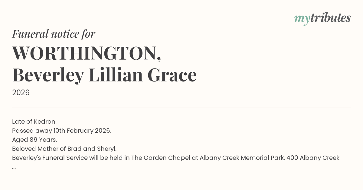 Beverley's Funeral Service will be held in The Garden Chapel at Albany Creek Memorial Park, 400 Albany Creek Road Bridgeman Downs, on Monday 23rd February 2026, at 1:30pm.